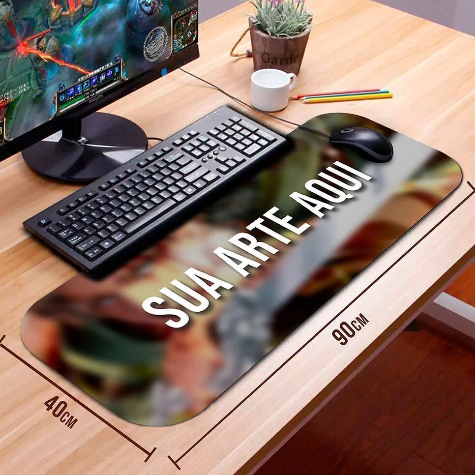 Mousepad personalizado com bordas arredondadas no tamanho 90x40cm e acabamento com costura lateral em nylon. Ele também conta com desenhos e cores nítidas, que não interferem no sensor óptico do mouse, tornando ainda mais dinâmicas as partidas.